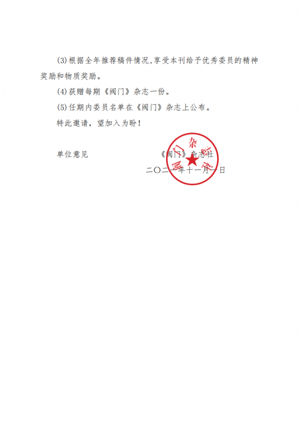 接2021年11月1日《閥門》雜志社邀請函:鑒于黃山良業項美根先生具有端正公道、治學嚴謹的良好道德品行以及在閥門業界享有的上佳美譽聲望和深厚學術造詣,特誠摯邀請項美根同志擔任本刊第六屆技術委員會成員。