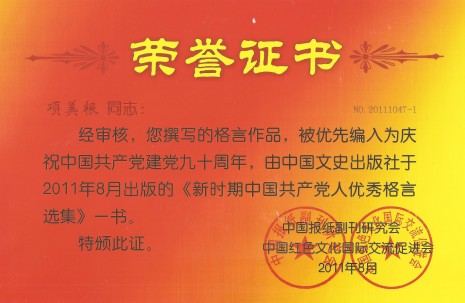 黃山良業(yè)閥門有限公司董事長、黨支部書記項(xiàng)美根同志,是一名有70歲年齡,35年黨齡的老黨員。最近,用他一身經(jīng)歷、體驗(yàn)、實(shí)踐而撰寫的格言作品,被優(yōu)先編入為慶祝中國共產(chǎn)黨建黨成立90周年,由中國文史出版社于2011年8月出版的《新是期中國共產(chǎn)黨人優(yōu)秀格言選集》一書。