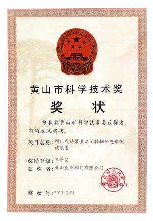 泵閥交易網訊 黃山良業閥門有限公司研制的“閥門氣動裝置啟閉轉矩連續測試裝置”因其有多項技術創新和國家專利,并經用戶使用證明具有良好的市場前景,最近經黃山市科技局評審,榮獲2011-2012年度黃山市科學技術進步三等獎證書。