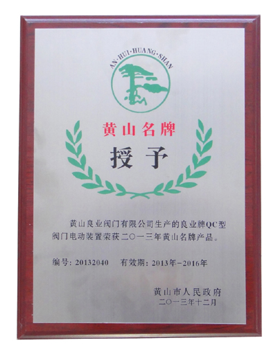 根據《黃山市名牌產品評價管理辦法》,市品牌戰略工作領導小組辦公室組織開展了2013年黃山名牌評價工作。經良業閥門公司自愿申請、專家審核、公示無異議,呈市政府研究同意,決定授予黃山良業閥門有限公司生產的良業牌QC型閥門電動裝置榮獲二0一三年黃山名牌產品。編號:20132040,有效期;2013-2016年。
