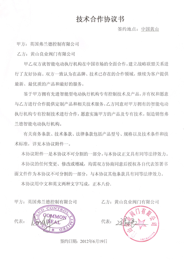 鑒于英國弗蘭德控制公司(UK Flend Control Limited)擁有世界先進水準的智能型電動執行機構專有控制技術及產品,黃山良業閥門有限公司又有良業的電動執行機構研究、開發與制造歷史與記錄。經雙方洽談,黃山良業閥門有限公司和英國弗蘭德控制公司最近正式簽訂了智能型電動執行機構在中國市場的全面合作協議。雙方一致認為在品牌、技術方面,已存在良業的的合作領域。決心繼續為客戶提供最新、最優質的產品和最好的服務。英國弗蘭德控制公司同意對黃山良業閥門有限公司的智能型電動執行機構專有控制技術進行合作,黃山良業閥門有限公司愿意實施英國弗蘭德控制公司的產品及專有技術,制造銷售弗蘭德智能型電動執行機構。此次技術合作,為黃山良業閥門有限公司今后的發展進一步奠定了基礎。