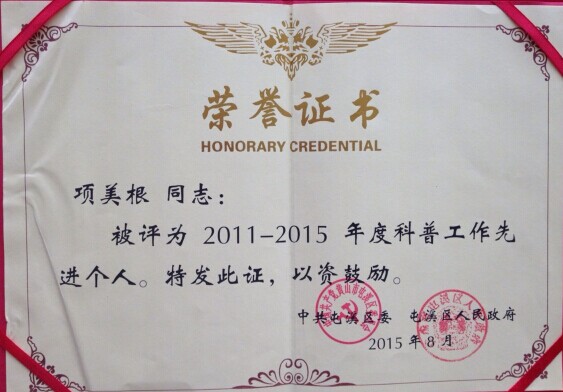 被評為“2011---2015年度先進科普工作者”